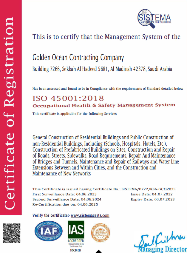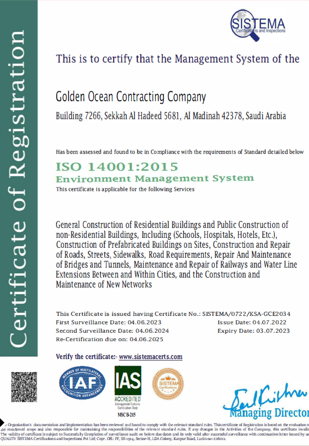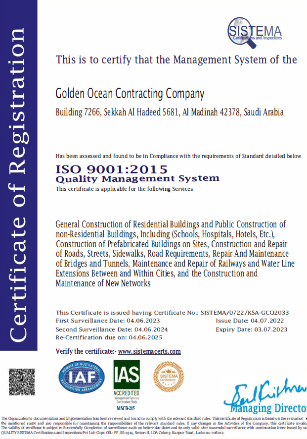 تفخر شركة المحيط الذهبي للمقاولات بمجموعة من الشهادات العالمية التالية: